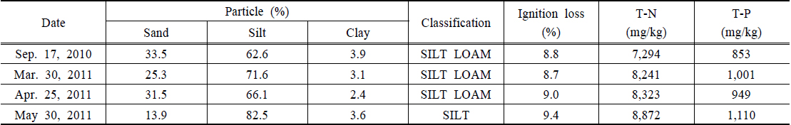 범위로 가장 높았다(Table 1, 2). 점토와 미세실트 등 크기가 작은 입자는 암모니아성 질소 및 인의 흡착능이 크다고 알려져 있기 때문에(Yu et al., 2006), 대상 지점 퇴적물의 오염도가 높을 것으로 판단된다. 채집된 시료의 모래, 실트, 점토의 입자 비율로 구한 토성은 2011년 5월 30일 시료가