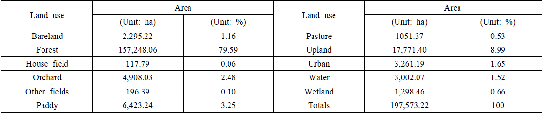 전국토의 20% 수준으로 나타나 이 지역을 전부 관리하기에는 한계가 있음을 알 수 있다(MOE, 2012a; MOE, 2012b). 그리고 Jang et al. (2015)에 따르면 국내 연평균 표토침식량은 토지 이용에 따라 큰 차이를 보이며, 특히 밭과 나지, 초지에서 발생하는 연평균 표토침식량이 높다고 제시하였다.