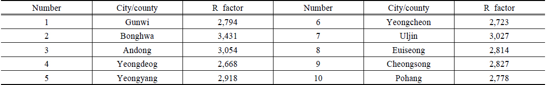 강우인자는 임하댐 인근 10개 지역에 대한 강우인자를 사용하였으며, Park et al. (2000)이 제시한 1973년~1996년까지의 강우인자를 사용하였다(Table 2, Fig. 2(a)). 그러나 이 값들은 실제 위치 좌표가 없는 지역별 강우인자임으로 행정구역도를 토대로 각 행정구역에 중심점을 설정하여 강우인자를 넣고 공간보간법(IDW)을