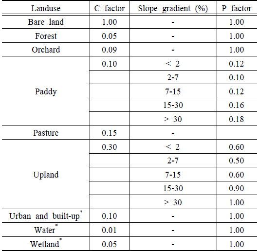 경사도와 경사장인자 (LS) (무차원), 작물피복인자 (C) (무차원), 작물경작인자(P) (무차원)의 5가지 USLE 인자가 필요하다(식 (1)).