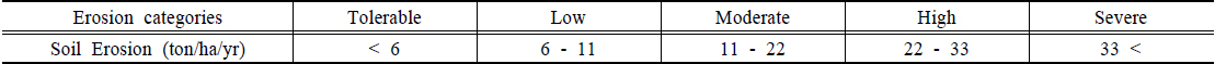 보고 있다. 따라서 33 ton/ha/yr 초과의 표토침식이 발생하는 지역은 표토침식을 관리하기 위한 대책을 마련해야함을 알 수 있다. 그러나 국내