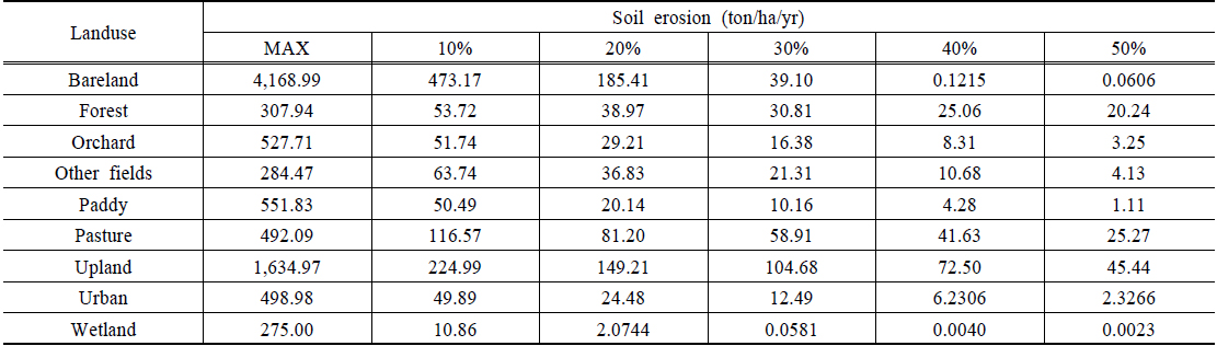 지역에 대하여 현장조사가 필요하고, 75 ton/ha/yr 초과하는 표토침식량 발생시 표토침식 대책이 필요한 지역으로 표토침식지표를 제시하고 있다(Table 5). 그리고 75 ton/ha/yr 미만의 표토침식량이 발생할 때는 표토침식 우려지역으로 표토침식지표를 제시하고 있다. 따라서 본 연구에서는 토지이용별
