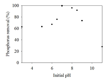 Effect of solution initial pH on phosphorous removal efficiency at [TiCl4]=0.45 mM.