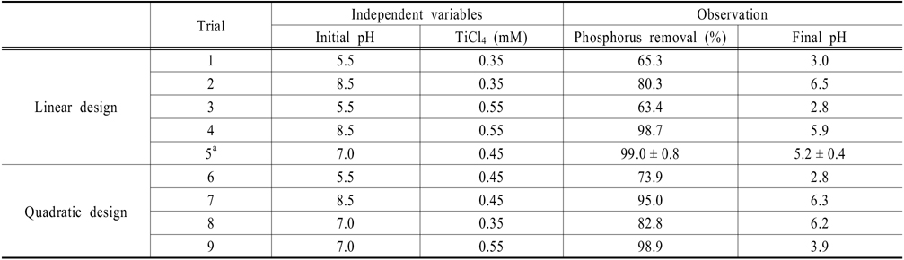 본 연구는 응집에 중요인자로 보고되고 있는 응집제 주입량과 초기 pH를 독립변수로 하여 인 제거효율의 최적조건을 알아보고자 중심합성설계법에 따라 실험을 계획한 후 실험을 수행하였다(Table 1). 선행연구(Kim et al., 2013; Zhao et al., 2011)와 3.1절의 결과에 따라 [TiCl4]는 인 제거 효율이 90% 이상인 범위 중 0.45 mM를 중심점으로 하여 0.35-0.55 mM, 초기 pH는 변곡점을 보이는 pH 7을 중심점으로 하여 pH 5.5-8.5의 범위에서 2인자 설계를 하여 총 9개의 실험점과 실험 자체의 순수오차를 보정하기 위해 중앙점(pH 7, 0.45 mM)을 3회 반복하여 총 11개의 실험을 수행하였다.