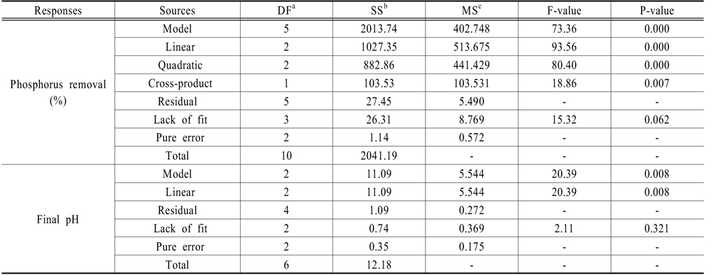 Analysis of variance for response of dependent variables (phosphorus removal and final pH)