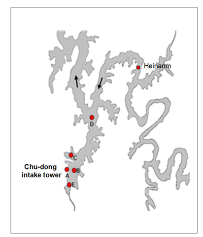 앞(E), 총 5개 지점을 대상지역으로 선정하였다. 각 지점의 특성을 설명하면 모든 지점은 5 m 수심별로 측정하였고, 추동취수탑은 수심 10 m로