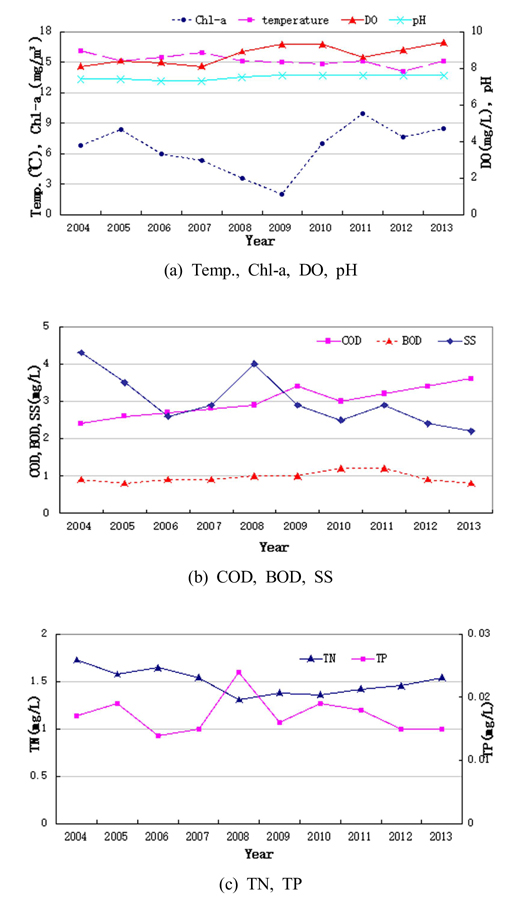 BOD, SS, T-N, T-P, 클로로필-a로 6 항목을 대상으로 수질오염공정시험기준(MOE, 2014)에 의해 실시하였다.