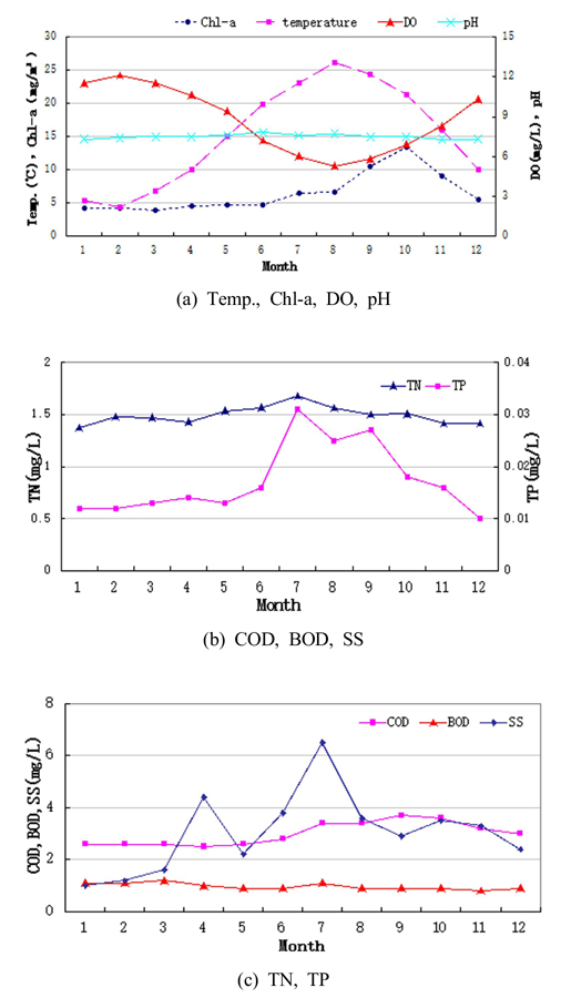 1.679 mg/L, 0.010 mg/L ~ 0.031 mg/L로 총질소에 비해 총인의 월별 변동폭이 비교적 큰 편이었고 하절기에 높은 농도를 보였다.