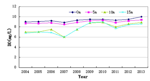 Fig. 5는 수심에 따른 수온변화를 보여주고 있다. 수온은 수심이 깊을수록 낮아지는 경향을 보였으며 표수층보다는 수심이 깊을수록 연도별 온도변화가 큰 것으로
