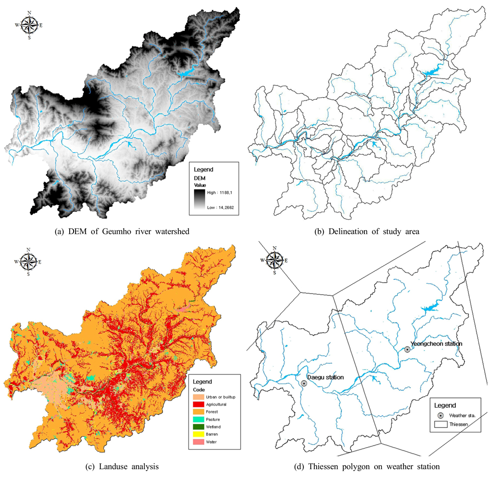 연속성을 확보해야 하기 때문에 모형의 구축은 금호강 유역 전체를 대상으로 하였다. 모형구축에 앞서 Thiessen 분석을 통해 금호강유역이 대구기상대와