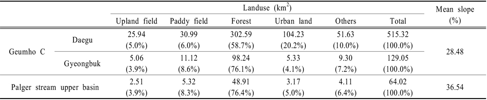 더욱 용이할 것으로 판단하였다. 연구지역은 대구광역시와 경상북도 칠곡군이 포함되며, 토지이용특성은 Table 1에 나타낸 바와 같다.