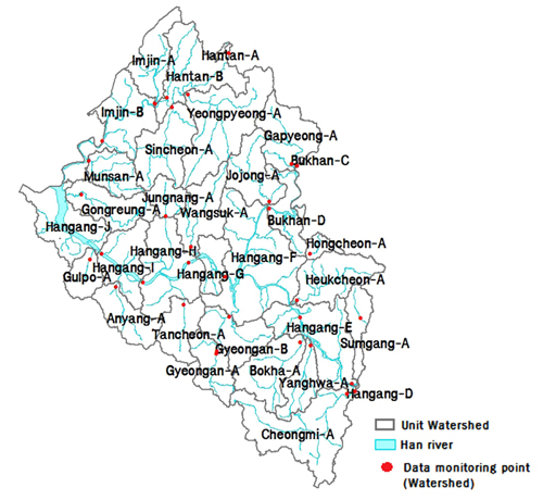하천 내 수질특성분석을 위한 대상유역은 해수유통구간인 한강J 단위유역을 제외한 31개 단위유역 말단 수질측정지점의 5년간 수질 측정자료를 분석하였으며,