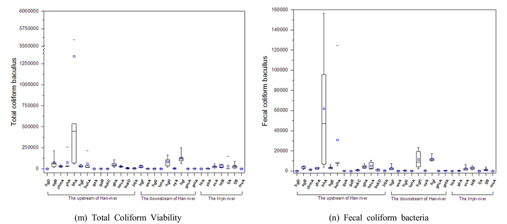 수질오염도를 분석하여 box형 그래프로 나타낸 결과이다. 유기오염 및 영양염류 수질항목의 경우, 한강하류 지류 중에 대규모 환경기초시설의 방류구가