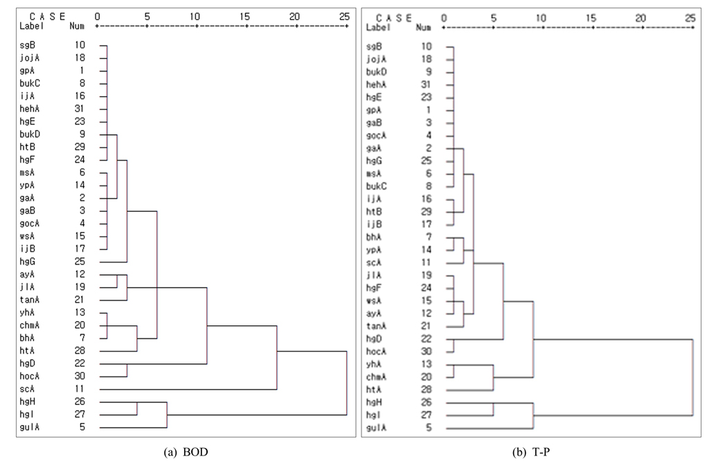 계층적 군집분석의 경우 자료의 편차가 크면 분석이 어려운 점이 있어 분석의 변수로 단위유역별 하천 14개 수질항목과 배출부하량 특성분석(BOD, T-P)