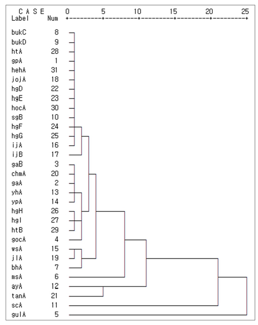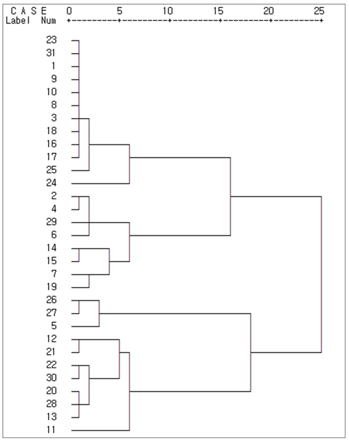 자료의 통계적 분석을 위하여 통계처리 프로그램인 SPSS (ver 17.0)를 이용하여 다변량 통계분석 중에 하나인 군집분석(cluster analysis)을