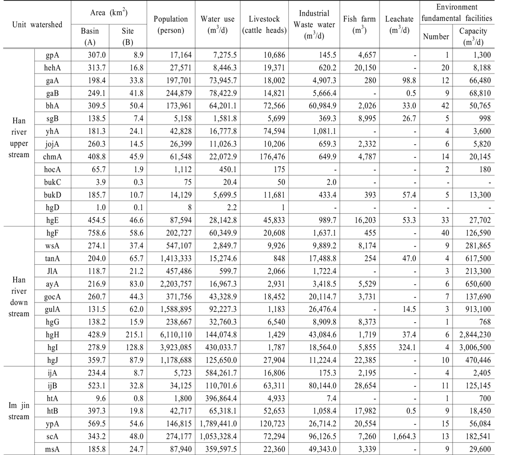 단위유역별 오염원 및 오염부하량 분석은 한강수계 수질오염총량관리시행계획 2013년도 이행평가 결과를 활용하였다. (Anyang-si, 2014; Anseong-si, 2014; Bucheon-si, 2014; Dongducheon-si, 2014; Gapyeong-gun, 2014; Gimpo-si, 2014; Guri-si, 2014; Gunpo-si, 2014; Gwacheon-si, 2014; Gwangju-si, 2014; Gwangmyeong-si, 2014; Goyang-si, 2014; Hanam-si, 2014; Icheon-si, 2014; In-cheon Metropolitan City, 2014; Namyangju-si, 2014; Paju-si, 2014; Pocheon-si, 2014; Siheung-si, 2014; Seongnam-si, 2014; Seoul, 2015; Uijeongbu-si, 2014; Uiwang-si, 2014; Yangju-si, 2014; Yangpyeong-gun, 2014; Yeoju-si, 2014; Yeoncheon-gun, 2014; Yongin-si, 2014;).