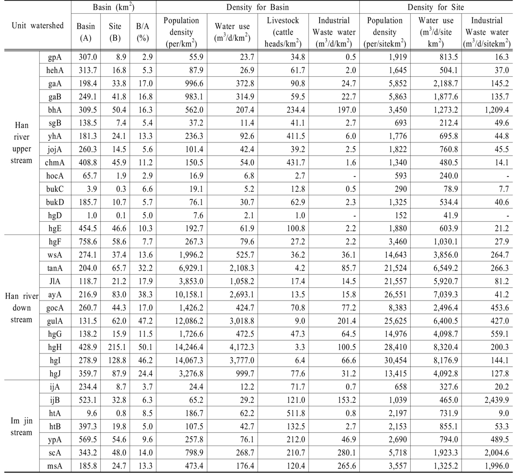한강H 단위유역은 단위면적당 인구밀도 및 물사용량의 밀도가 가장 높았으며, 단위면적당 축산 사육두수의 밀도가 높은 단위유역은 한탄A와 청미A 단위유역,