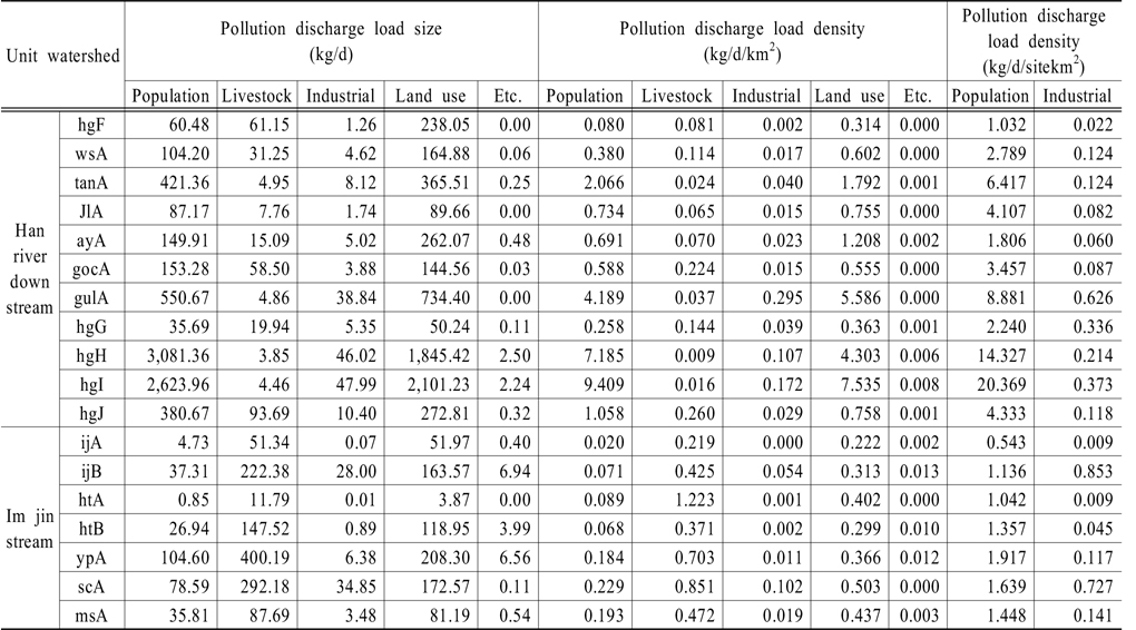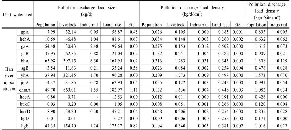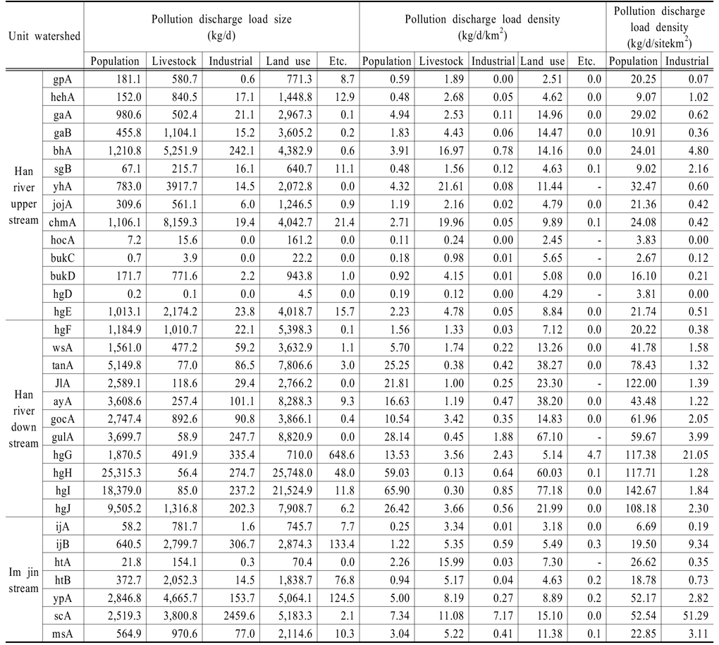 오염물질의 배출부하특성 분석을 위하여 단위유역별 배출부하량을 해당 단위유역의 면적을 기준으로 오염원 그룹별, 점·비점배출부하량 밀도를 산정하였다.