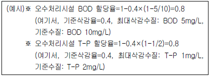 법적기준수질을 곱하여 하였다. 또한, 삭감량 산정에 동일률 수질개선 20%를 적용하였는데 이는 예시와 같이 BOD 10 mg/L를 8 mg/L로 처리하는