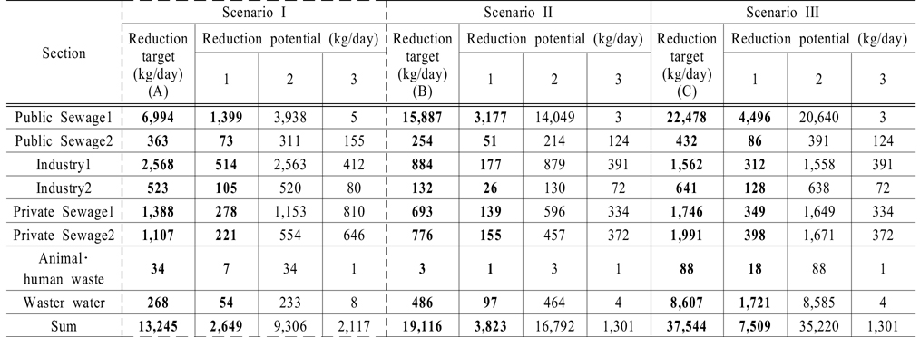시나리오 I, II, III의 BOD 저감 대상량은 Table 3과 같이 각각 177,561 kg/일, 96,606 kg/일, 187,658 kg/일로 나타났다. BOD의 경우 1단계 시행성과 등으로 법적방류수질보다