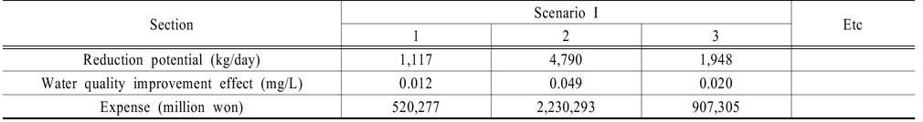 수질개선효과 분석에서 민간시설(산업1 2, 오수1 2)의 시나리오 I의 삭감잠재량을 분석한 결과 Table 7과 같이 동일률수질개선(20%)<1> 방법에서 0.012 mg/L의 수질개선이 가능할 것으로 판단되며 이는 낙동강 전체 기본계획 수립시 저감하고자