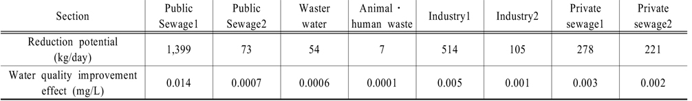 삭감잠재량 대비 수질 개선효과는 Table 8과 같이 산업1 0.005 mg/L, 오수1 0.003 mg/L, 오수2 0.002 mg/L, 산업2 0.001 mg/L 으로 공공하수1이 0.014