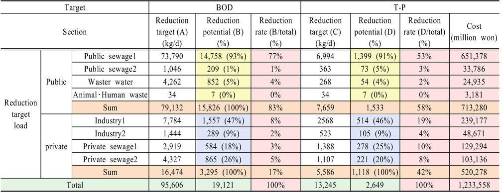 산정하고, 공공 및 민간 개별배출시설의 T-P삭감 잠재량과 이에 따른 수질개선효과, 공공시설 대비 비용편익 분석도 수행하였다.