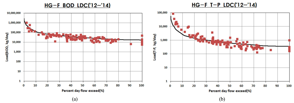 최근 TMDL의 이행평가 및 삭감계획에 널리 이용되고 있는 LDC는 하천의 전체 유량 조건에서 실측수질과 목표수질과의 관계를 나타내는 곡선이다(U. S. EPA, 2007). LDC는 오염총량관리 목표수질 및 부하량 등을 시각적으로 표현하므로 목표수질 초과 빈도수와 크기 등을 쉽게 알 수 있다. 또한 LDC는 목표수질을