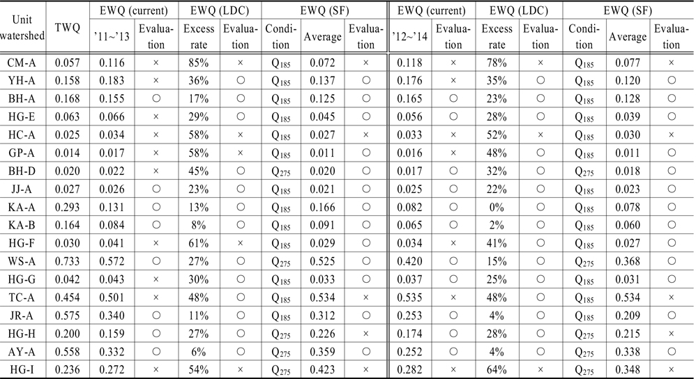 2) 목표수질 달성여부를 평가한 결과 LDC에 의한 평가방법이 현행 방법보다 약 20% (4~6개 단위유역) 정도 초과율이 줄었으며, 이는 현행방법이