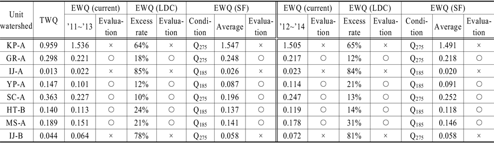 현행 평가방법과 LDC평가방법, 기준유량조건 평가방법의 결과를 비교하였다. 각 방법별로 다르게 나타났으나 LDC 평가방법에 의한 방법이 기존방법보다