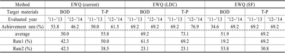 2회 연속 달성율도 세가지 방법 중 BOD, T-P 모두 LDC 평가에 의한 방법이 가장 높게 나타났으며, 2회 연속 초과율은 LDC평가방법이 가장