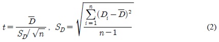 여기서, 는 각 표본요소의 값들의 차이의 평균값, SD는 표본요소들의 차이 값들의 표준편차이다.