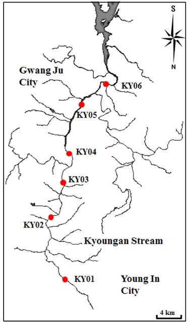 하천복원사업이 시행되기 전인 2007년에 조사된 경안천 생태조사(GIHE, 2008)의 저서성 대형무척추동물 군집자료와 비교하기 위해, 사업 이후인 2012년 10월부터 2013년 9월까지 동일한 6개 지점에서 계절별 조사(4회)를