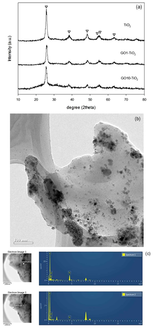 (a) XRD pattern of TiO2, GO1-TiO2 and GO10-TiO2 (∇:anatase), (b) TEM image of GO0.1-TiO2 and (c) EDS spectrum of GO0.1-TiO2.