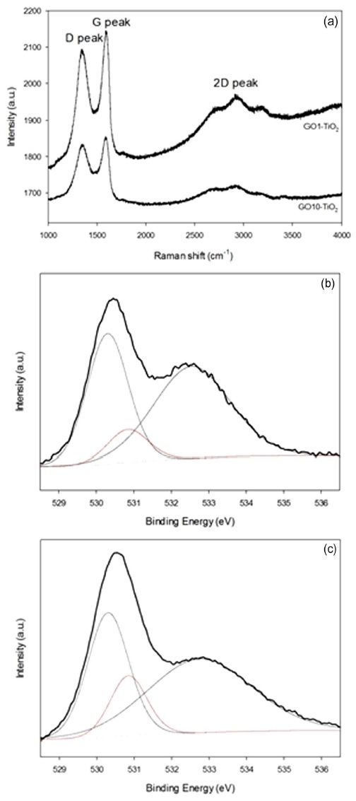 (a) Raman spectra of GO1-TiO2 and GO10-TiO2 and O 1s core level XPS spectra of (b) GO1-TiO2 and (c) GO10-TiO2.