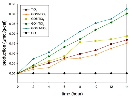 기존 TiO2의 개질방법인 금속 도핑이나 환원된 GO과 조합의 경우는 개질물질의 높은 전자전달율을 통한 전자전달 개선 효과로 인해 광환원의 효율이 증가하게 된다(Tan et al., 2013). 이에 반하여 이번 연구에 사용된 GO는 그래핀에 비해 전도율이 낮아 전자전달 측면에서 불리하며 이는 메탄생성에 부정적인 영향을 끼친 것으로 추측된다.
