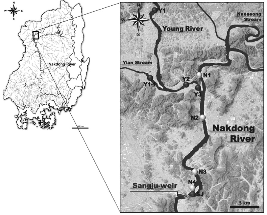 증가하는 경향을 보였으며, 영강의 주요 지천인 이안천(Y1-1)에서는 조사기간 동안 Aphanizomenon 속의 출현이 확인되지 않았다(Fig. 3). 영강 수계에서는 낙동강과 합류점을 기준으로 12 km 상류지점까지 출현이 확인된 반면, 영강으로 유입되는 이안천에서는 Aphanizomenon 속의 출현이 전혀 확인되지 않아, 유속이 감소하는 하류 말단 지점에서 주로 증식한 것으로 추정되었다. 한편 낙동강 본류에서는 조사기간 동안 Aphanizomenon 속의 지점별 기하평균 개체수는 N1에서 50 cells/ml, N2에서 792 cells/ml, N3에서 4,172 cells/ml, N4에서 2,463