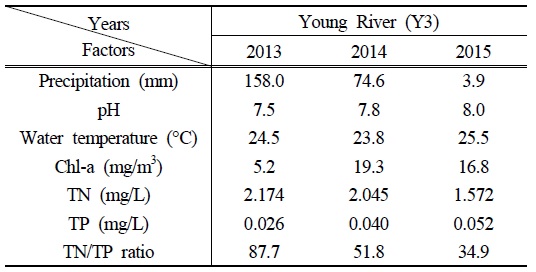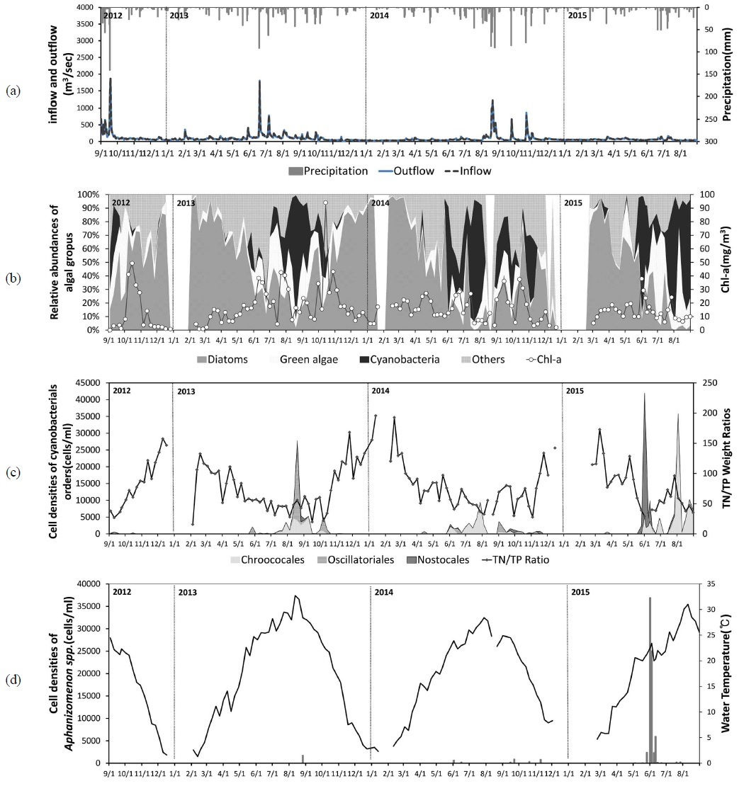 확인되었다. TN/TP ratio는 남조류 증식에 중요한 환경요인이며, 낮은 TN/TP ratio(weight)는 N2 고정능이 있는 Aphanizomenon 속과 같은 분류군에게 유리한 증식조건으로 작용한다(Lehman et al., 2009). 한편 식물플랑크톤의 성장은 수리·수문학적 특성에 밀접한 영향을 받게 되는데, 유수생태계에서 수리·수문의 변동은 강수량에 밀접한 영향을 받는다.