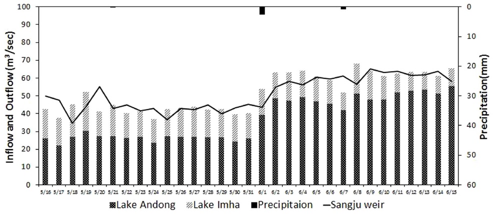 Aphanizomenon 속이 대량 발생한 2015년 6월 1일을 기점으로 상류에 위치한 안동댐의 방류량이 26.5 m3/sec에서 49.5 m3/sec로 크게 증가한 것으로 나타났으며, 여기에 영향을 받는 상주보의 유입량 또한 43.7 m3/sec에서 60.2 m3/sec로 증가하였고(Fig. 5), 그 결과 상주보의 수리학적 체류시간이 7.4일에서 5.6일로 감소하였다. 유입량의 증가는 체류시간의 감소를 유발하여 식물플랑크톤의 증식을 방해하는