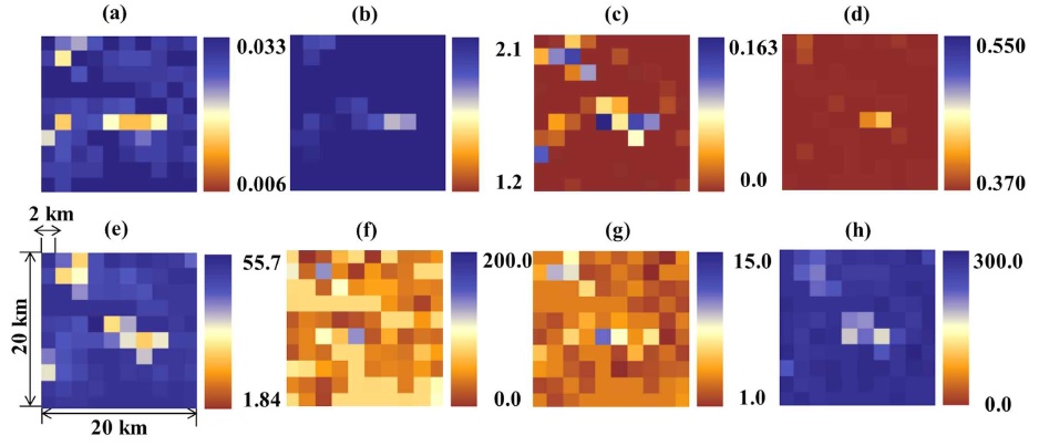 ์งํ(์ฒญ๋ฏธ์ฒ ์ง์ 1, Fig. 2(a))๊ณผ ํ์ผ์ง์ญ(์ฒญ๋ฏธ์ฒ ์ง์ 2, Fig. 2(b))์ ๊ณต๊ฐ์ ์ผ๋ก ๋ถํฌ๋์ด ์๋ ํ ์์๋ถ ๋ถํฌ๋ฅผ ๋ํ๋ธ๋ค. ์ฒญ๋ฏธ์ฒ ์ง์ 1์์๋ ์ ์ฒด ์ ์ญ์ ์ข์ธก ์๋จ, ์ค๊ฐ ๋ฐ ํ๋จ ๋ถ๋ถ์์ ์งํํน์ฑ์ ๋ฐ๋ผ
