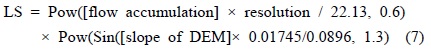 지형인자(LS)는 사면길이인자(L)와 사면경사인자(S)를 통합한 하나의 무차원인 인자로 지형에 따라 값이 결정된다. LS인자는 사면길이가 길고 경사가