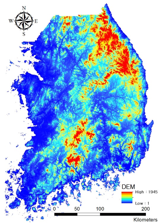 × 100 m 해상도의 DEM을 추출하였다. 이때, resample의 방법은 bilinear interpolation을 이용하였다(Lin et al., 2010).