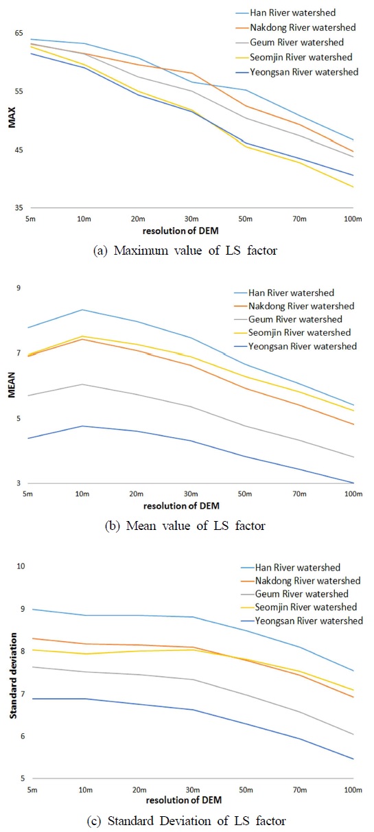 따른 LS 인자 값을 전국단위로 분석하여 비교·분석하여 USLE LS 인자 산정시 필요한 최소한의 DEM 해상도가 무엇인지를 제시하고자 한다.