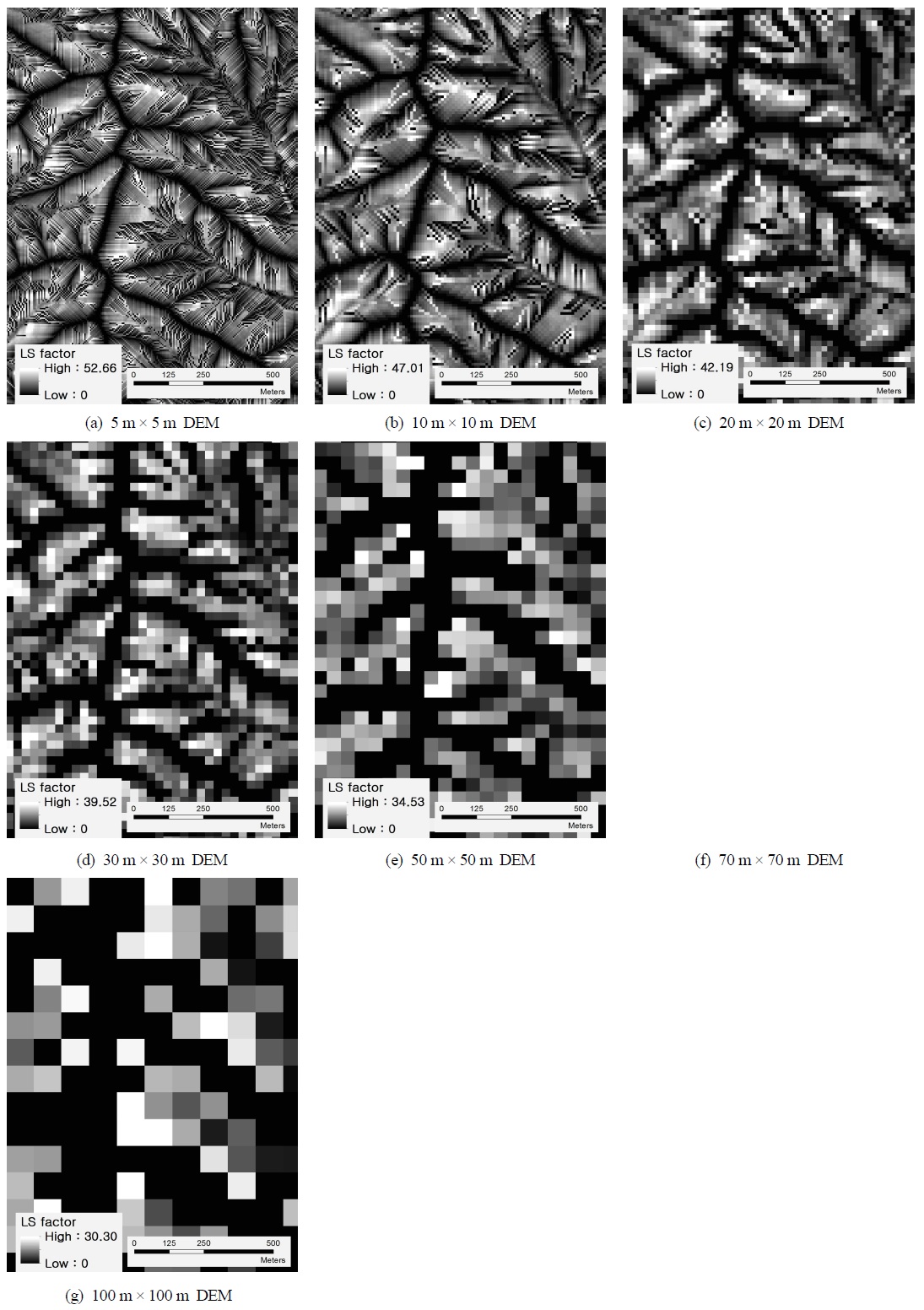 토양유실량을 산정함에 있어 LS 인자를 제외한 나머지 인자들의 관측값은 DEM 격자 크기에 상관없이 동일한 관측값을 적용하여 토양유실량을 산정하였다.