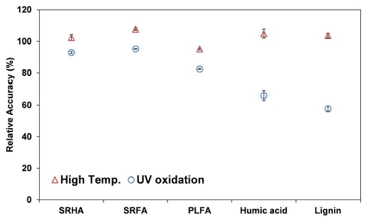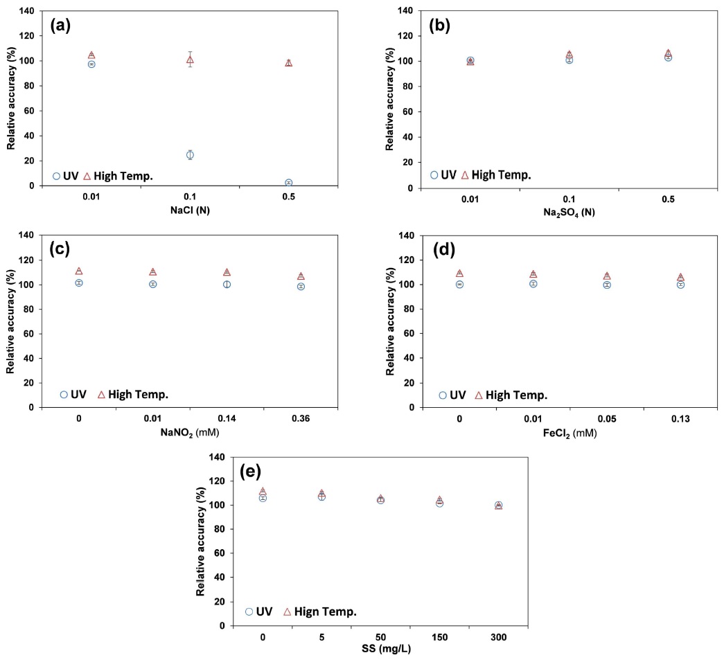 Jung et al. (2013)은 TOC 장비별로 산업폐수에 대한 산화율을 비교한 결과 동일 시료에 대해 최대 4-10배의 농도차이가 있음을 보고하였다. 동일한 연구에서 UV산화방식의
