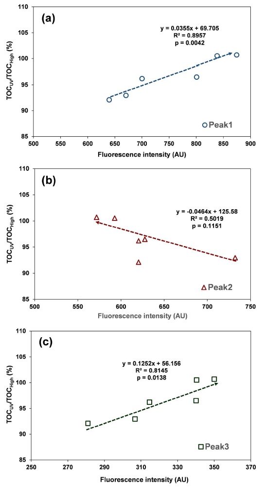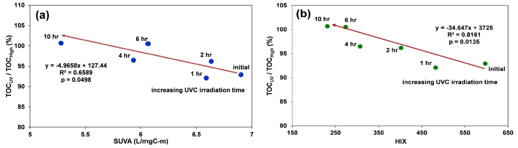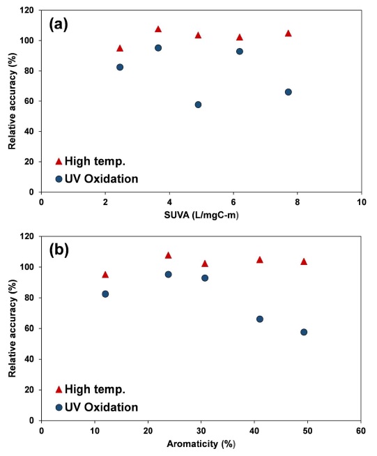 경우 일부 시료에서는 전혀 산화되지 않거나 과도한 농도값을 보였다. 한편 Benner and Hedges (1993)의 연구결과에 따르면 담수 시료의 경우 고온산화 방식과 UV산화방식에서 측정한 TOC 농도 간의 유의한 차이는 관찰되지 않았다. Byun et al. (2009)은 다양한 유기물을 함유한 시료에 대해 고온산화 방식과 UV산화방식에서 TOC 농도 간의 유의한 차이를 보였으며 이는 UV산화방식에서 크게 50%