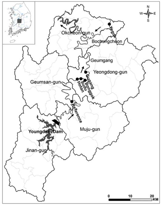 Map showing the study area in Geum River, Korea. Circles indicate study sites. Arrows