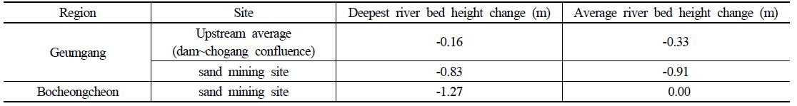 자연유황을 보였다. 금강상류 하상고의 변화를 살펴보면 전체적인 최심하상고 및 평균하상고가 낮아졌고 특히 골재채취가 이루어진 지역에서는 평균하상고가