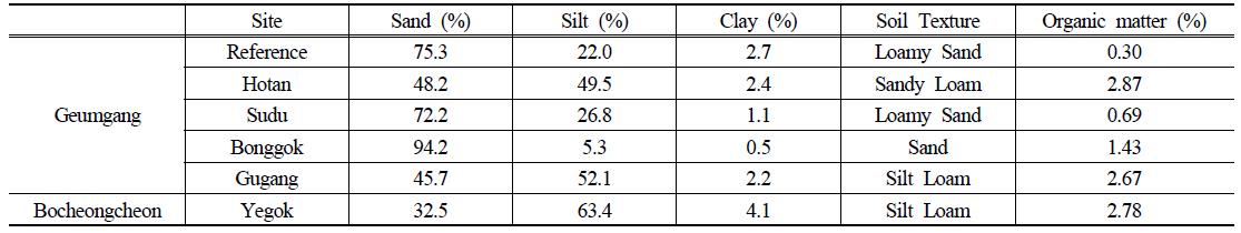 후 식생사주에서 봉곡리 지점을 제외하고는 토양의 실트 비율(26.8~63.4%)이 높고 유기물 함량(1.43~2.87%)이 높았다(Table 3). 사주 토성의 변화는 하상저하에 따른 영향으로 판단되며, 골재채취로 인하여 하상안정화 기간 동안 세굴된 지점에는 다시 모래 등의 하상재료가 쌓이면서
