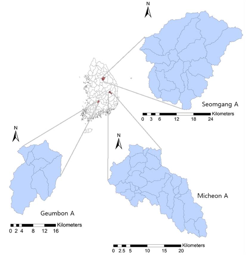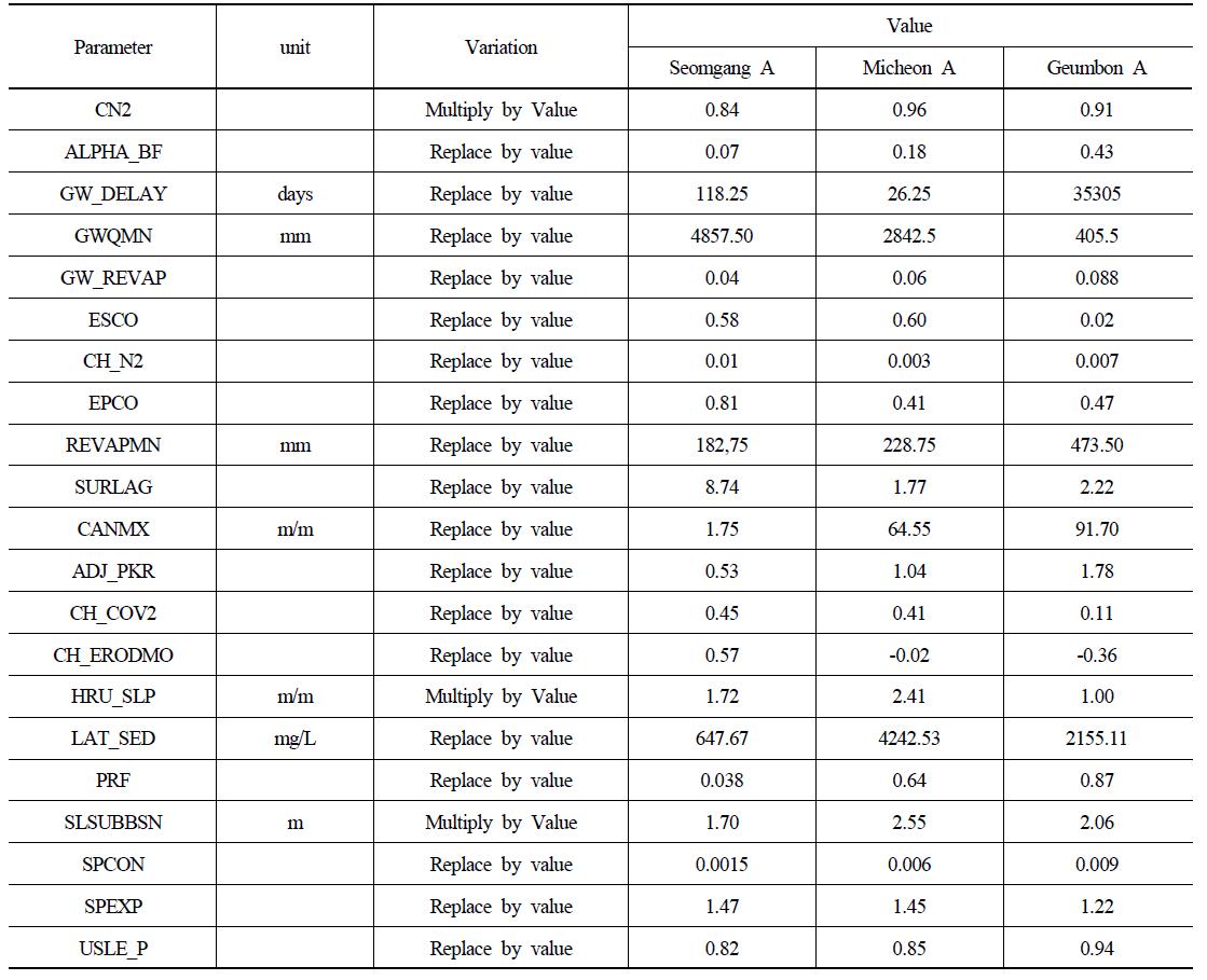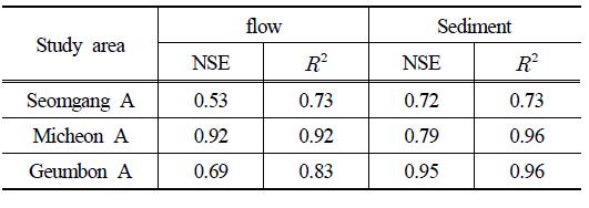 사용하였고, 유출량과 유사량에 관련된 21개의 매개변수를 이용하였다. 보정에 사용된 매개변수와 보정 값은 Table 5와 같으며 섬강 A유역의 유출량에 대한 NSE, R2는 각각 0.53, 0.73, 유사량에 대한 NSE, R2는 각각 0.72, 0.73으로 나타났다. 미천A 유역의 유출량에 대한 NSE, R2는 각각 0.92, 0.92, 유사량에 대한 NSE, R2는 각각 0.79, 0.96이며, 금본A 유역의 유출량에 대한 NSE, R2는 각각 0.69, 0.83, 유사량에 대한 NSE, R2는 각각 0.95, 0.96으로 모두 높은 적용성을 보이는 것으로 나타났다(Table 4). Fig. 7 유출량 및 유사량 보정 결과 Donigian and Love (2003)가 제시한 기준을 만족하였고, 이를 통해 본 연구의 SWAT 모형의 모의 결과가 자연 현상을 잘 모의하는 것으로 사료된다. 본 연구의 결과에서 보이는